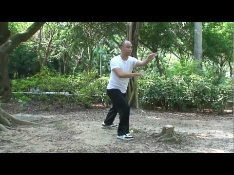 三、右半身略向左轉按低,同時右手亦隨身體的動作下按,