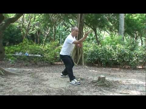 一、身體向左腿移動成左弓步,右手同時向前伸出,左手內卷至掌心面向自己,然後又再水平向後移動,重心移於右腿上成虚步,同時兩手再如拉弓狀前後分開。