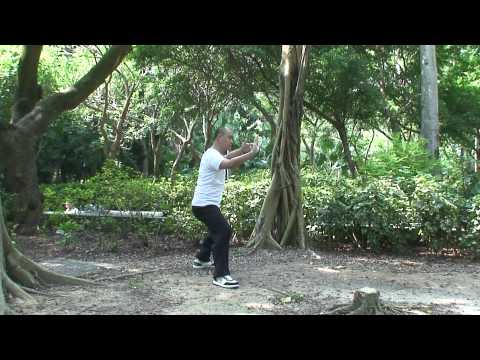 八、兩掌於小腹前手心相對右前左後相對,然後左掌中指微點右手脈門,跟着兩腿垂直向下略蹲坐,同時兩手向下向前插出。再向上穿,這時候身體隨兩手上穿的動作徐徐立直,兩手