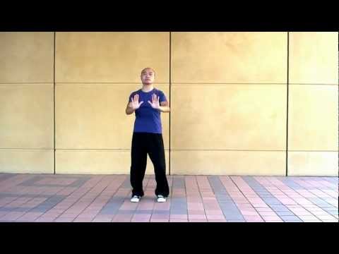五、身體以腰胯為軸,帶動兩手轉向右邊,當轉至右邊的時候,右手反掌掌心向外,兩手同時向外向下按,動作不停繼續兩掌一齊由下而上,由右至左,劃一大弧形,向左斜方伸出,兩掌與肩平,兩掌前後相對,指尖向左,眼看左掌。